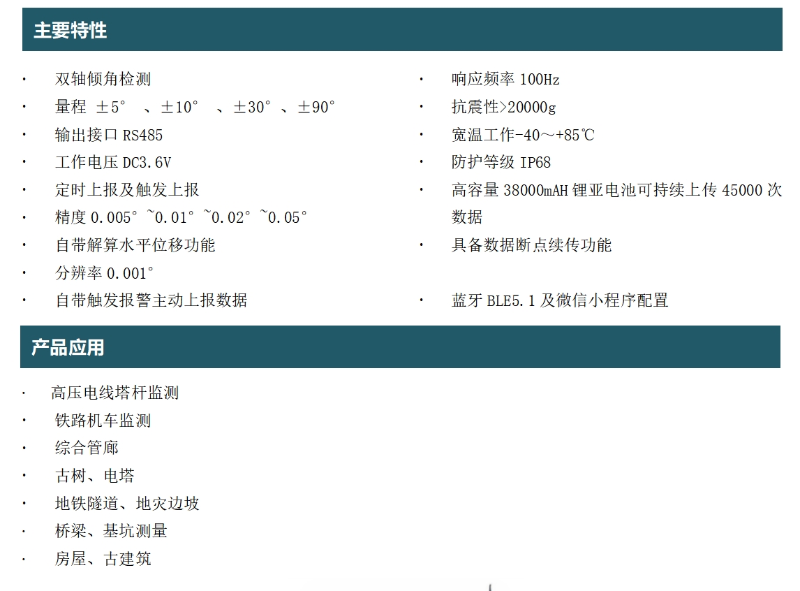 PTH-QJ06低功耗無線傾角傳感器、無線傾角計為一款高性能高集成的智能低功耗產(chǎn)品,其是一款基于4G/GSM傳輸?shù)膬A斜角度測量設(shè)備,具有其獨特性、創(chuàng)新性、高集成性,該產(chǎn)品選用目前最新的全網(wǎng)通物聯(lián)網(wǎng)無線芯片,配套物聯(lián)云平臺實現(xiàn)遠程數(shù)據(jù)采集、監(jiān)控、分析、巡察、報警、歸類、地理位置定位、數(shù)據(jù)報表曲線下載,手機等移動設(shè)備APP軟件實現(xiàn)隨時隨地監(jiān)控報警等功能的產(chǎn)品。采用標準的MODBUS/TCP標準通訊協(xié)議,該款產(chǎn)品以微處理器為核心,能可靠的實現(xiàn)傾角、水平位移、電量等信號的采集和處理,可實現(xiàn)數(shù)據(jù)定時上報及觸發(fā)上報等功能。